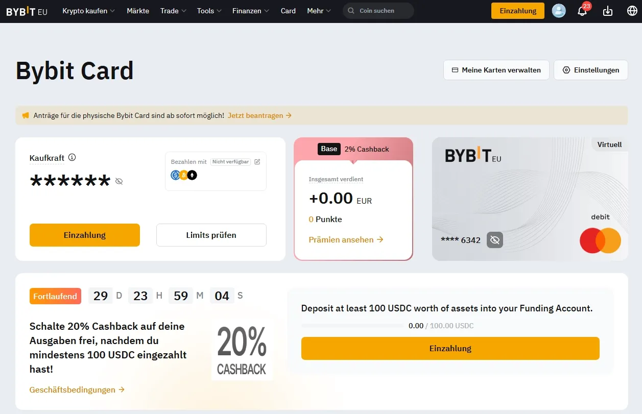 Beide Karten lassen sich parallel nutzen und komfortabel über das Bybit-Dashboard im Web oder in der App verwalten – inklusive individueller Limits, Sicherheitseinstellungen und Transaktionsübersicht.