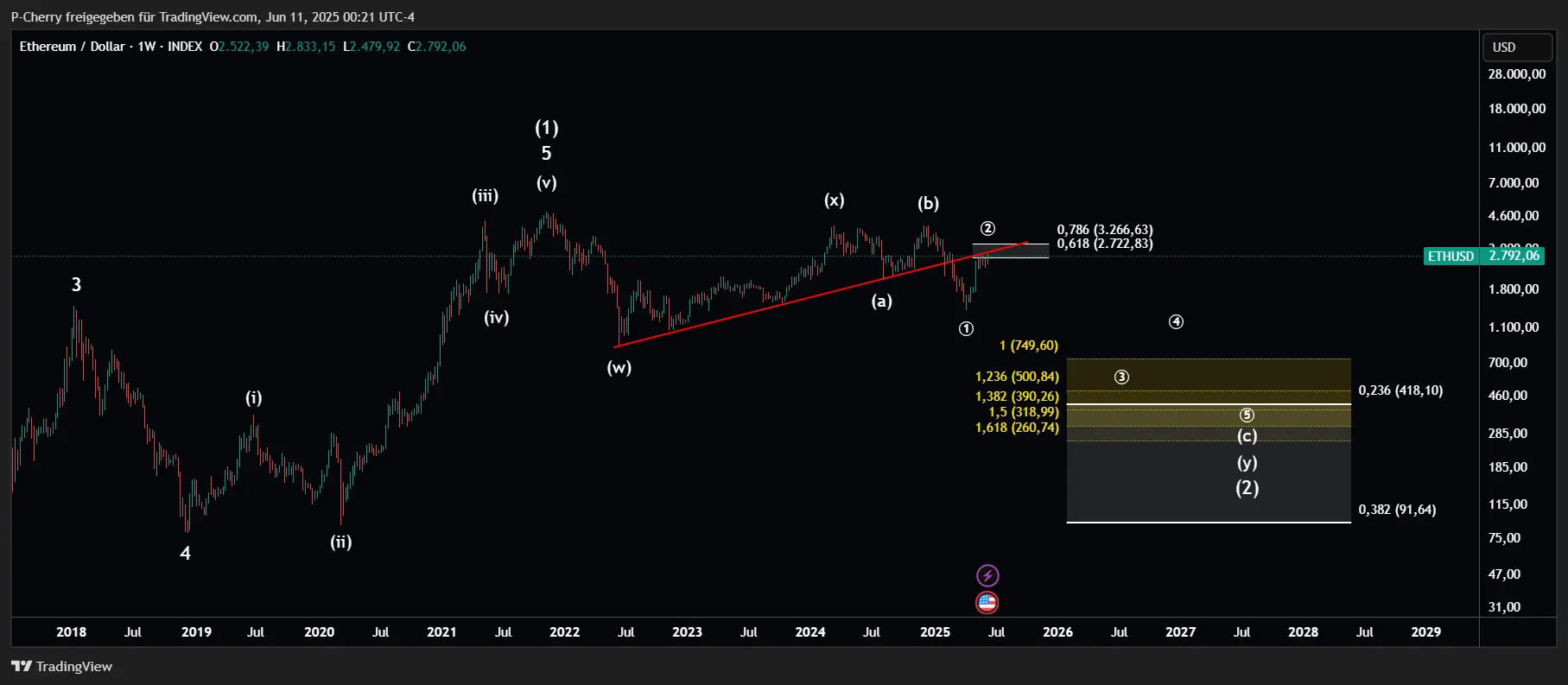 Sollte Ethereum bereits im November 2021 sein Hoch gesehen haben, wäre ein Rückfall in die gelbe Zielzone zwischen 750 und 260 US-Dollar möglich. Die rote Trendlinie entscheidet über das Szenario. - 🔔 Jetzt ETH kaufen oder handeln: