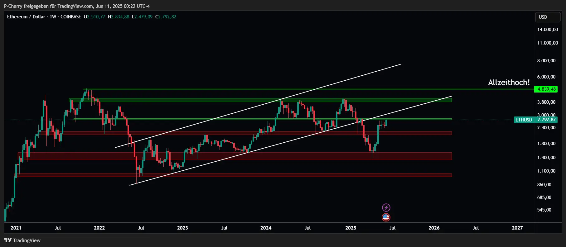 Der starke Anstieg der letzten Wochen gibt dem ETH-Kurs die Möglichkeit auf ein neues Allzeithoch, noch in diesem Bullenmarkt-Zyklus. Aktuell kämpft Ethereum jedoch noch mit der Widerstandszone von 2.800 US-Dollar. Sobald diese überwunden ist, dürfte ein weiterer steiler Kursanstieg folgen.
