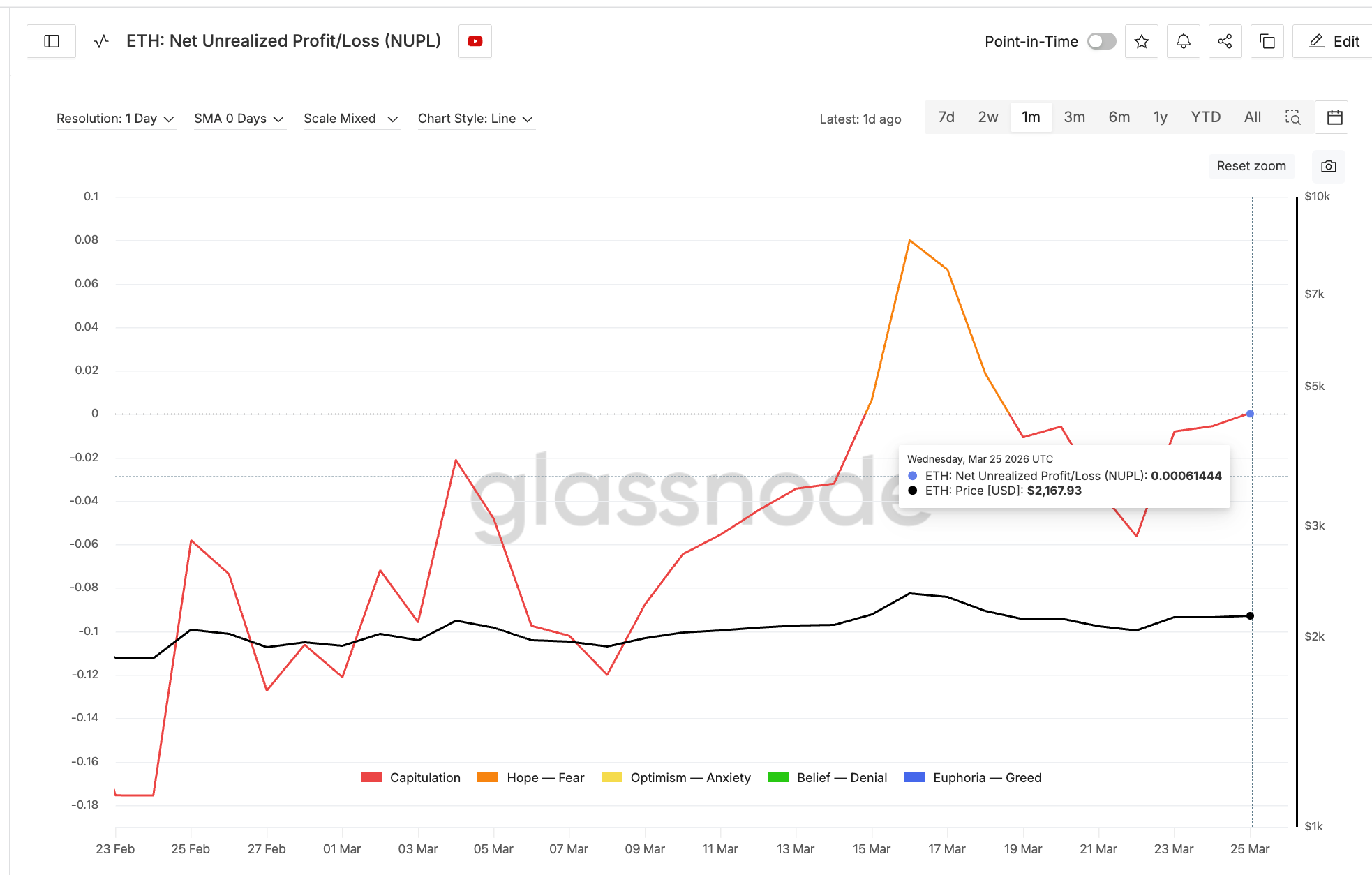 Auch ein Blick auf die Profitabilität der Anleger zeigt eine klare Veränderung im Markt. Anfang März lag der NUPL-Indikator noch tief im negativen Bereich, viele Investoren waren deutlich im Verlust und hatten kaum Anreiz zu verkaufen. Genau diese Situation ermöglichte die anschließende Aufwärtsbewegung.