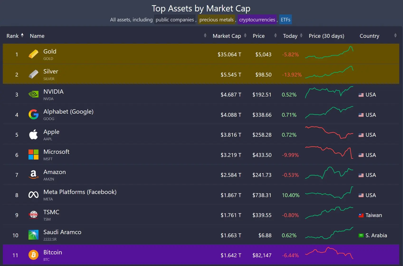 Bei einem Kursniveau von teils unter 82.000 US-Dollar lag die Marktkapitalisierung gestern bei rund 1,65 Billionen US-Dollar, womit Bitcoin weltweit auf Rang elf zurückfiel.